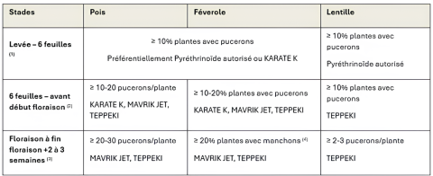 1) Si présence simultanée sitones et seuil dépassé, choisir une solution également autorisée sitones. Il est préférable de conserver les aphicides spécifiques pour de plus fortes infestations et/ou pour leur autorisation durant la floraison.