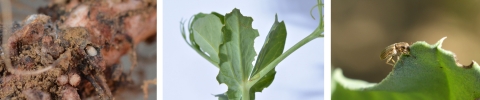 Larve de sitone dans nodosité - Encoches sur feuilles - Sitone adulte (photos L.jung - Terres Inovia)