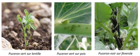 Le pois et la lentille sont généralement colonisés par des pucerons verts du pois (Acyrthosiphon pisum). Celui-ci présente une couleur verte à rose et se cache souvent sous les feuilles et dans les nouvelles feuilles émergentes et plus tard dans les boutons floraux.