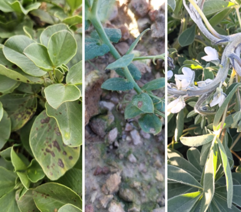 Lupin : Peuvent être observés fréquemment l ‘anthracnose et la rouille, et moins fréquemment, le botrytis et la maladie des taches brunes.