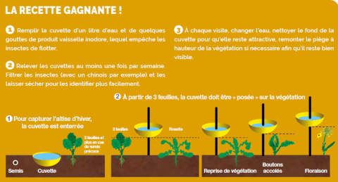 - Enterrée : efficace vis-à-vis de l’altise d’hiver (ou grosse altise), qui se déplace par petits sauts au niveau du sol et n’est pas attirée par le jaune. Pour ce faire, creuser un trou pour que le bord de la cuvette soit au niveau du sol. Les insectes sont d’autant plus piégés qu’ils sont nombreux et aussi actifs.