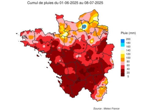 Comme il est coutume de le dire, « les années se suivent mais ne se ressemblent pas… » Cette phrase pourrait parfaitement résumer les conditions de récolte de cette année 2025, complètement opposées à l’année précédente, mais non sans conséquences sur les travaux de sols des futures implantations de colza. Dans un contexte de structures de sols pouvant avoir été dégradées lors des implantations des céréales de l’automne dernier, les conditions sèches et chaudes depuis plusieurs mois ont rendu les sols dans un état de sécheresse pouvant être extrême dans certains secteurs. Les perturbations et orages de ces dernières semaines ont été très hétérogènes selon les secteurs, dont nombre d’entre eux ont été très peu arrosés par la perturbation des derniers jours, comme le montre la carte ci-dessous.