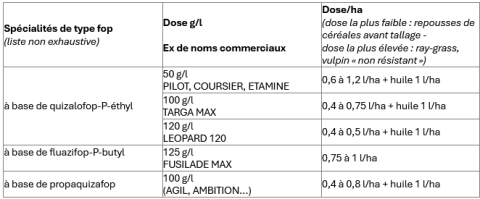 Sur repousses, préférer les produits de la famille des « fops » pour leur rapidité d’action. Réserver les produits de type dimes, souvent plus onéreux et moins rapides d’actions, pour un usage anti-ray-grass ou anti-vulpin.
