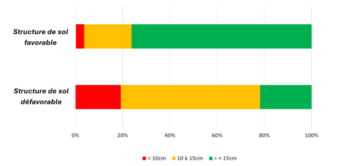- Obtenir une structure du sol favorable à un bon enracinement du colza : il est donc préférable avant le semis de restaurer une qualité structurale optimale à l’enracinement du colza sur 15 à 20 cm de profondeur. Il est important de déterminer à quelle profondeur se situe l’éventuelle compaction. Aucune obligation de travailler à 20 cm, si le souci est seulement à 8 cm. En l’absence de pluies significatives dans les prochaines semaines permettant de réhumecter l’ensemble de la profondeur de sol nécessitant un travail de sol, une question risque de se poser : l’enracinement du colza peut- il se mettre en place de manière optimale si l’on réalise uniquement un travail de sol de surface pour préparer le lit de semence ? L’expérimentation en bandes mise en place dans le Berry l’été dernier visant à comparer la réussite du colza dans des contextes de structures de sol favorables ou défavorables montre bien que, malgré un semis précoce et une croissance optimale durant tout l’automne, l’état structural aura un impact sur l’homogénéité et la profondeur de l’enracinement, et plus particulièrement la capacité que pourra avoir le colza à avoir une majorité de pivots atteignant au moins 15cm de profondeur (voir graphique ci-dessous).