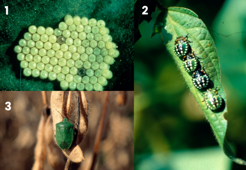 1. Oeufs de punaises groupés, 2. Punaises au stade 4, 3. Punaise adulte