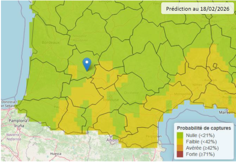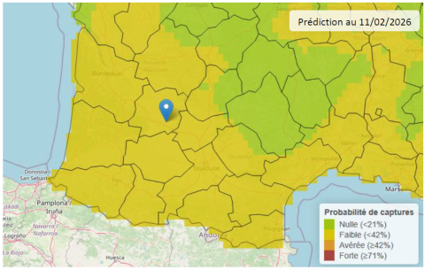 Des premières captures significatives ont été enregistrées ces derniers jours, traduisant une reprise d’activité du ravageur dans la région. Néanmoins, les conditions météorologiques annoncées (pluie et vent) restent peu favorables aux vols, généralement déclenchés en présence de températures douces (≥ 12°C), d’ensoleillement et de faible vent.